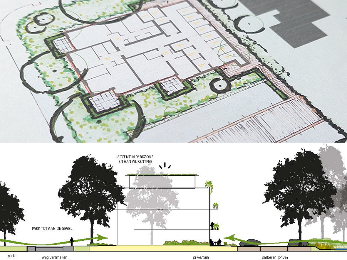 Met als doel tot een goede ruimtelijk-landschappelijke inrichting te komen van de nieuwbouw werd de locatie zowel op wijk-, straat-, als kavelniveau belicht. De kavel is gelegen aan de hoofdentree van de wijk die de een parkstructuur van de wijk doorsnijdt. De huidige eenlaagse bebouwing zal plaats maken voor een accent aan de hoofdontsluiting én parkstructuur. Een sobere brede groene plint van bodembedekkende beplanting met bloeiende accenten vormt een natuurlijke overgang van park naar gebouw, die het gevoel geeft dat het park doorloopt tot aan de gevel.