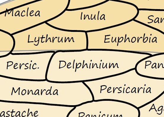 Beplantingsplan De assortimentstuin voorziet in ca. 450m2 plantenborders. Hoofdfunctie van deze tuin is dat de leerlingen hier de verschillende plantensoorten kunnen leren. De vaste planten zijn gerangschikt op alfabet, zodat ze eenvoudig kunnen worden teruggevonden door de leerlingen. De ondiepe zone in de vijver biedt ruimte voor het assortiment waterplanten. Op enkele plekken zijn gemengde en thematische borders aangebracht. Dit vormen stuk voor stuk bijzondere plekken in de tuin. Net als de pergola met klimplanten die tegelijkertijd de overgang vormt naar de Demotuinen. In de demotuinen is ruimte voor het tonen van nieuwe beplanting en producten. Ruimtelijk vormen de Demotuinen een onderdeel van de assortimentstuin.