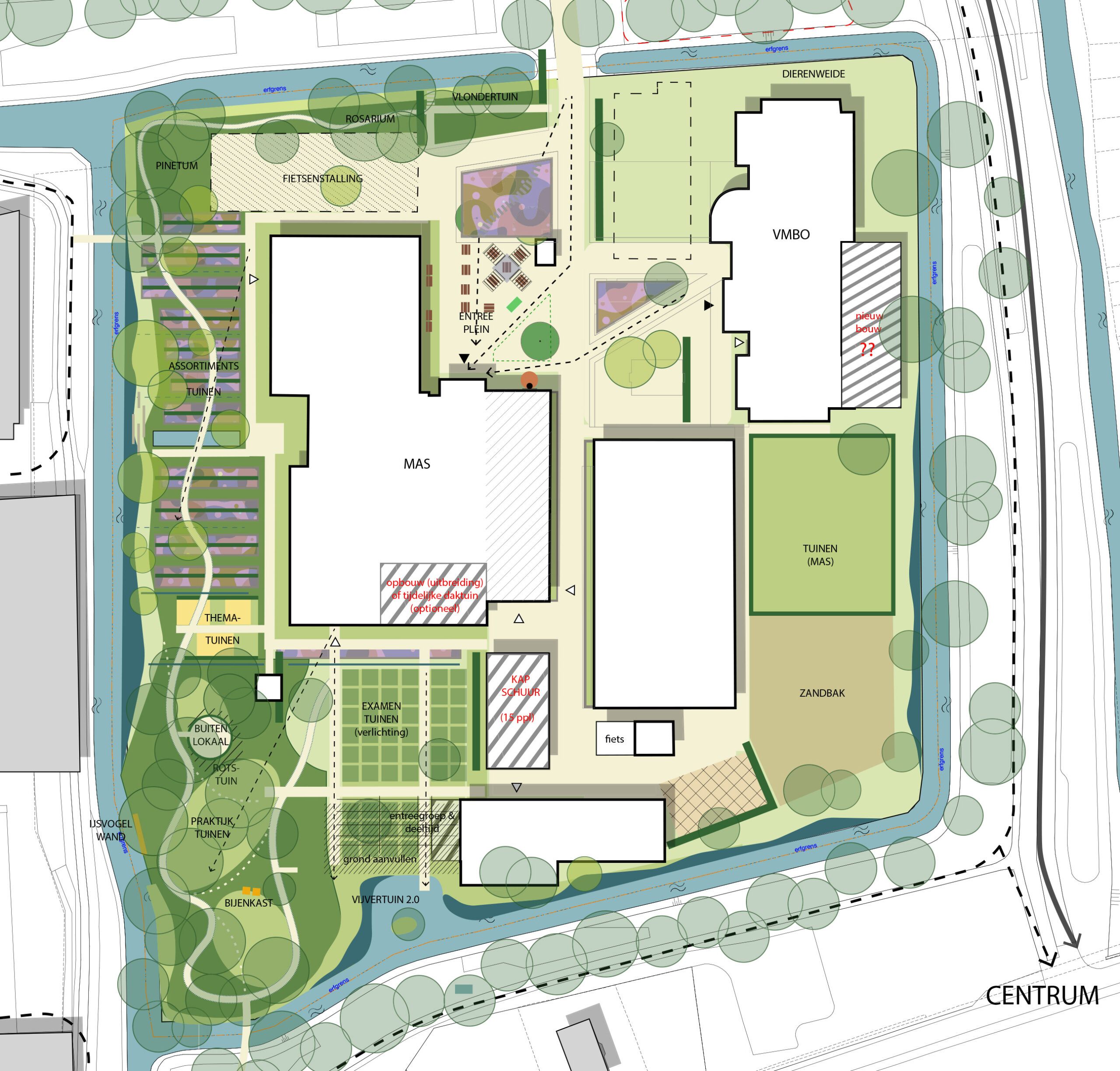 Tegelijkertijd creëren de plantenborders een aantrekkelijk tuinbeeld. Doordat de borders haaks op het gebouw gepositioneerd kijk je vanuit de lokalen en vanaf het pad rondom het gebouw over de plantenborders, tegen een decor van de parkrand langs het water. De borders worden begrensd door een band van cortenstaal en zijn omgeven door halfverharde paden. In het midden van elke border staat een 1m hoge haag, die de richting van de plantbedden accentueert. Een stapelmuurtje van hergebruikt materiaal, scheidt met een sierlijk gebogen lijn de vaste planten van de heestervakken.